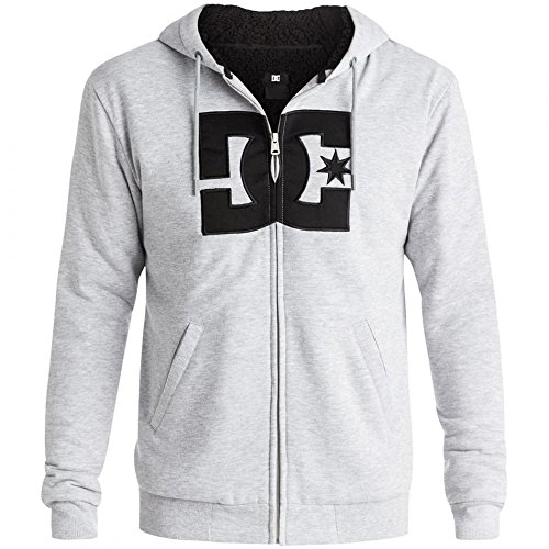 DC Mens Rebel Star Sherpa Hoodie, Heather Grey - Zip-up hoodie features a large black DC logo twill applique with bourdon embroidery on front along its heather grey colourway. Constructed with a zippered front closure, contrasted back neck twill tape and a DC label.